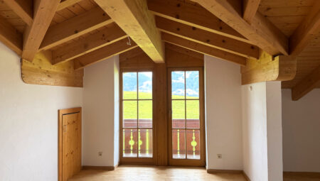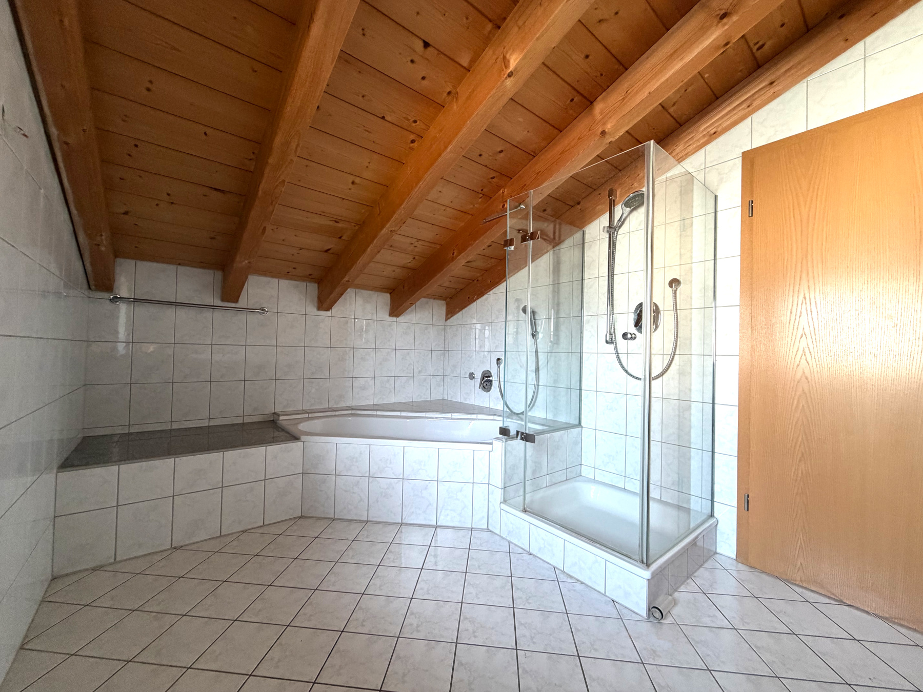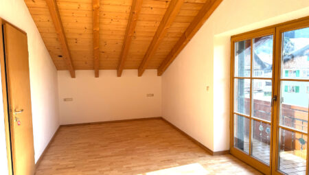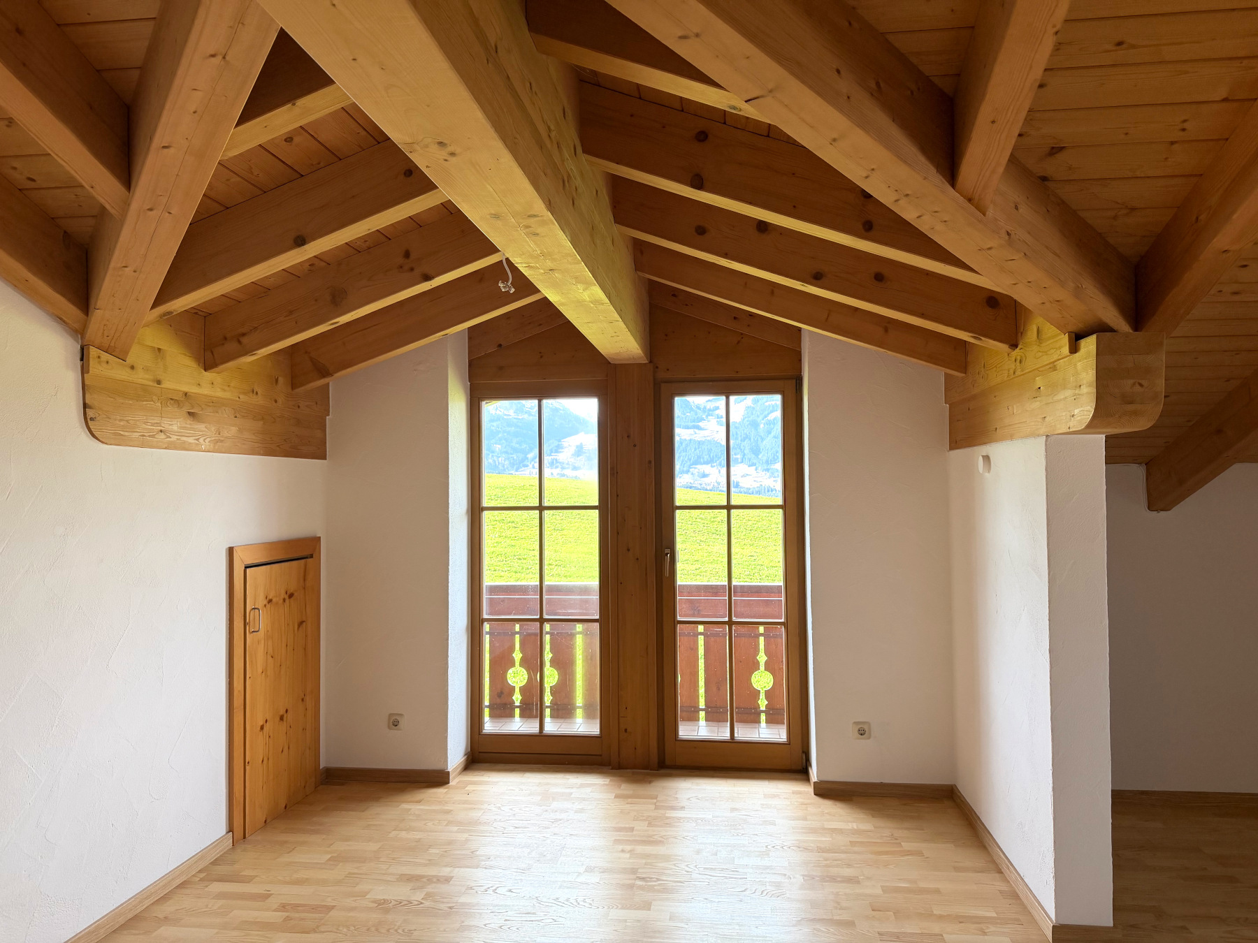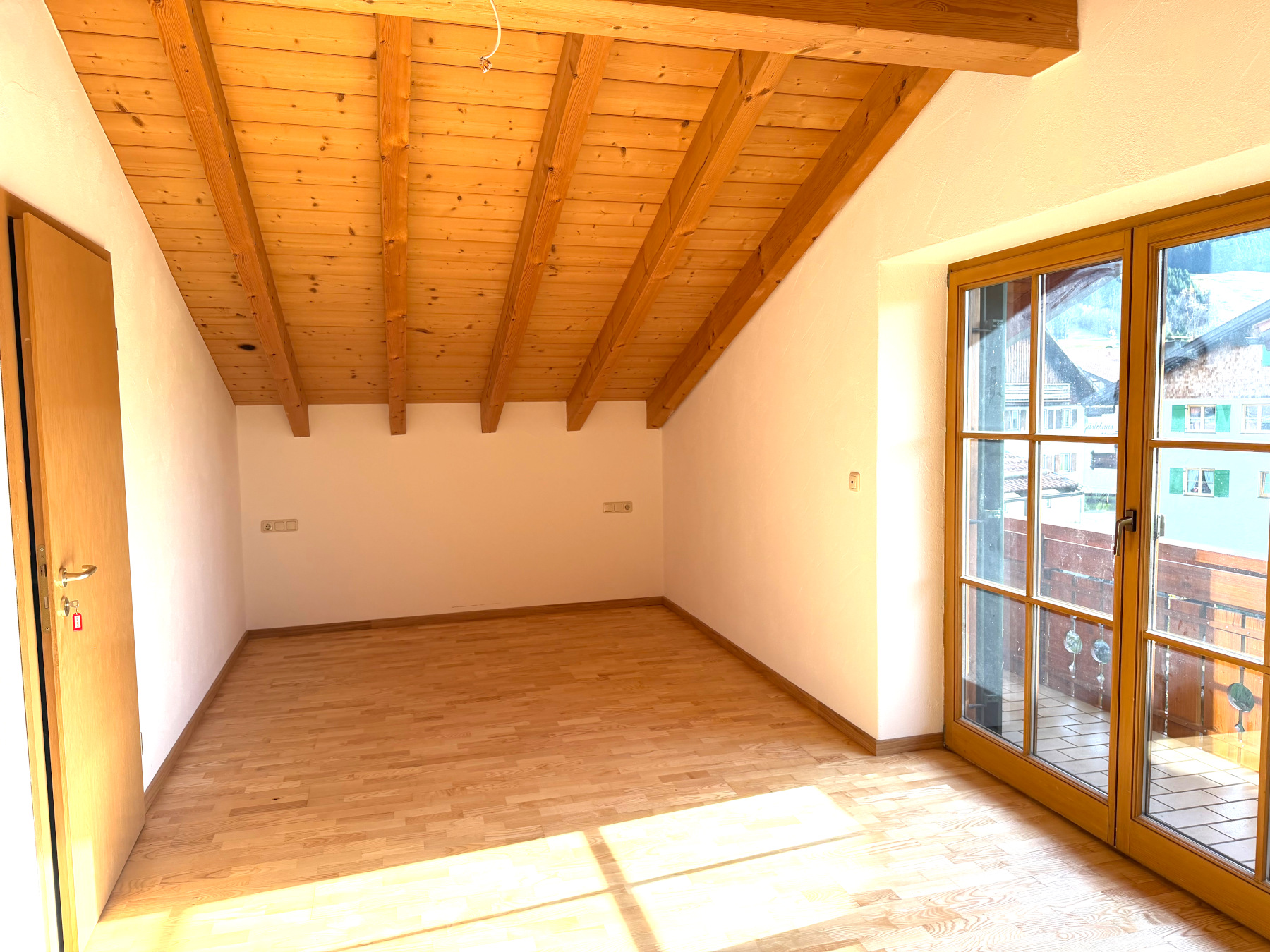 Im Obergeschoss ist das großzügige Schlafzimmer. Von hier aus gelangt man auf den Südbalkon, von dem aus man die Spitze des Rubihorns sieht. Das danebenliegende Zimmer ist ebenfalls schön groß und hat einen eigenen Balkon, der nach Westen ausgerichtet ist. Bad und WC sind voneinander getrennt. Das Badezimmer ist mit einer Wanne, einer Dusche und einem Doppelwaschbecken ausgestattet. Die sichtbaren und offenen Holzdecken im Obergeschoss sorgen für eine besondere Wohlfühlatmosphäre