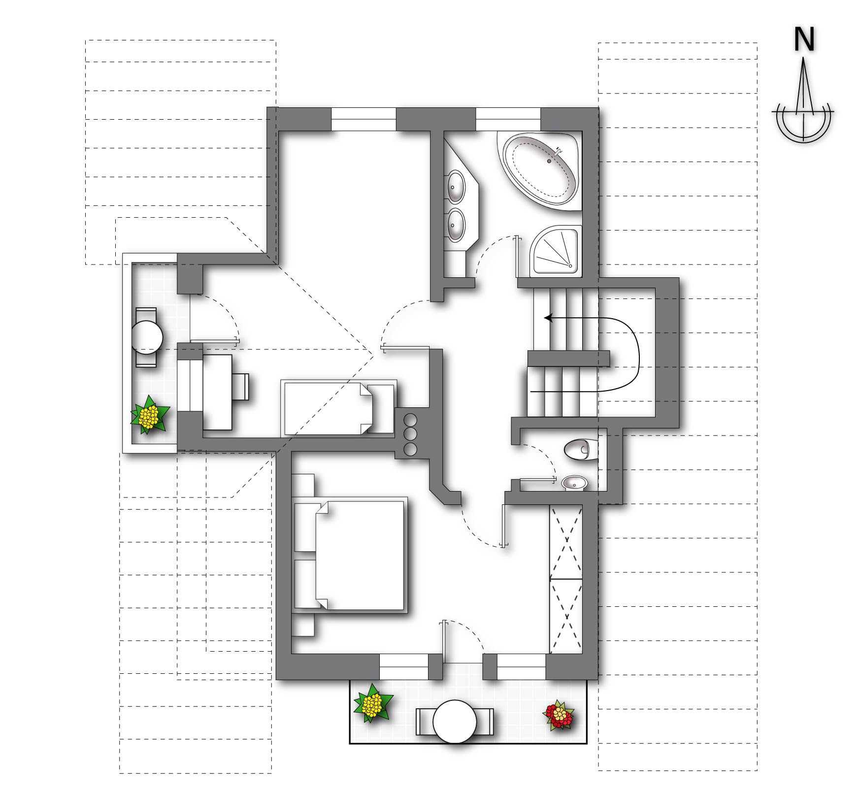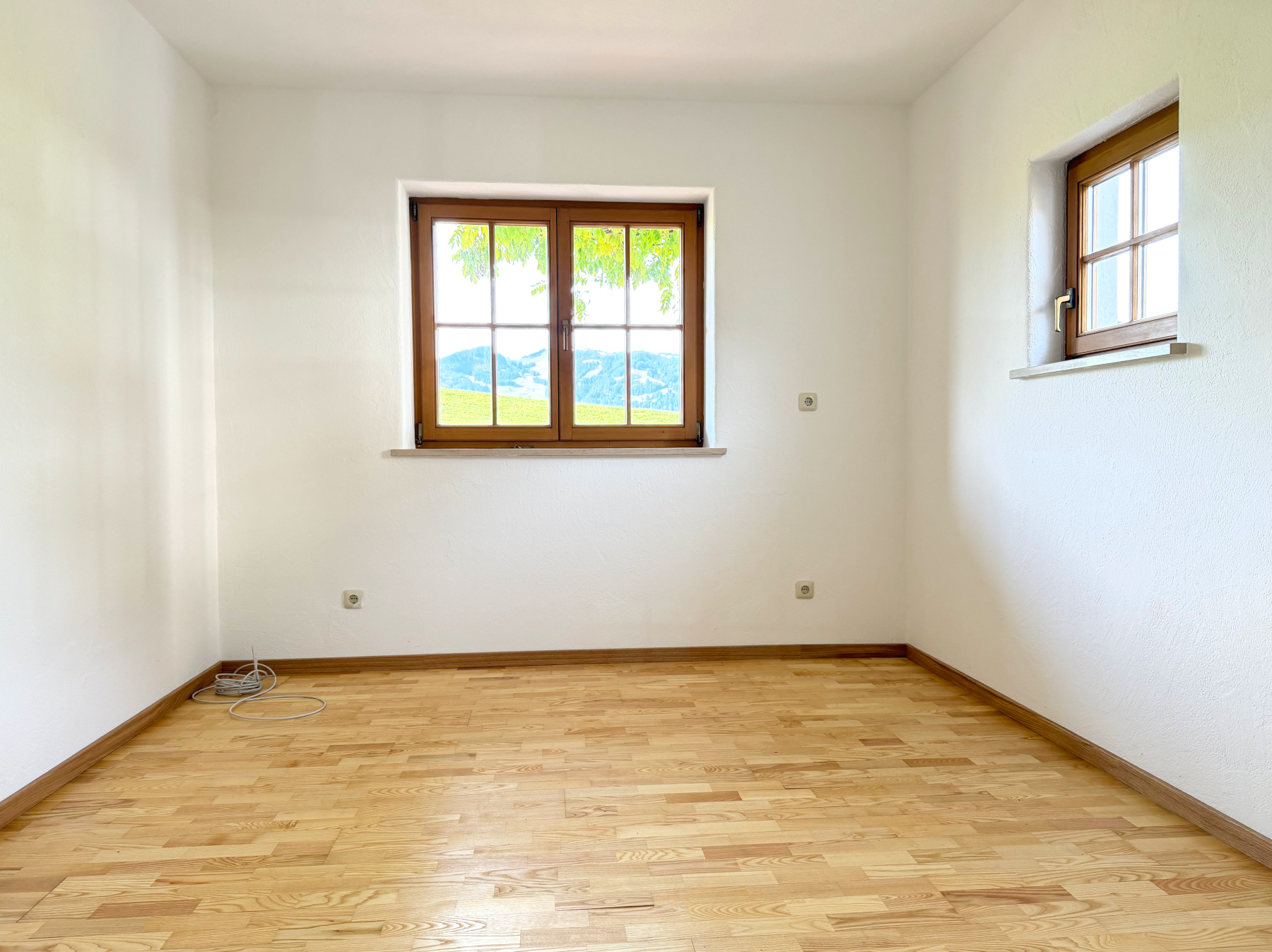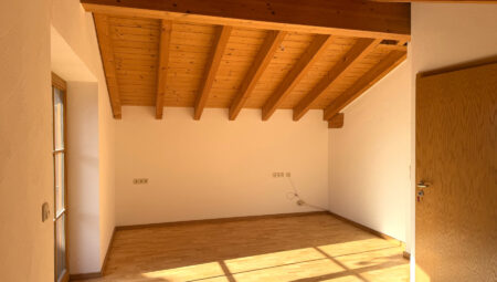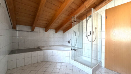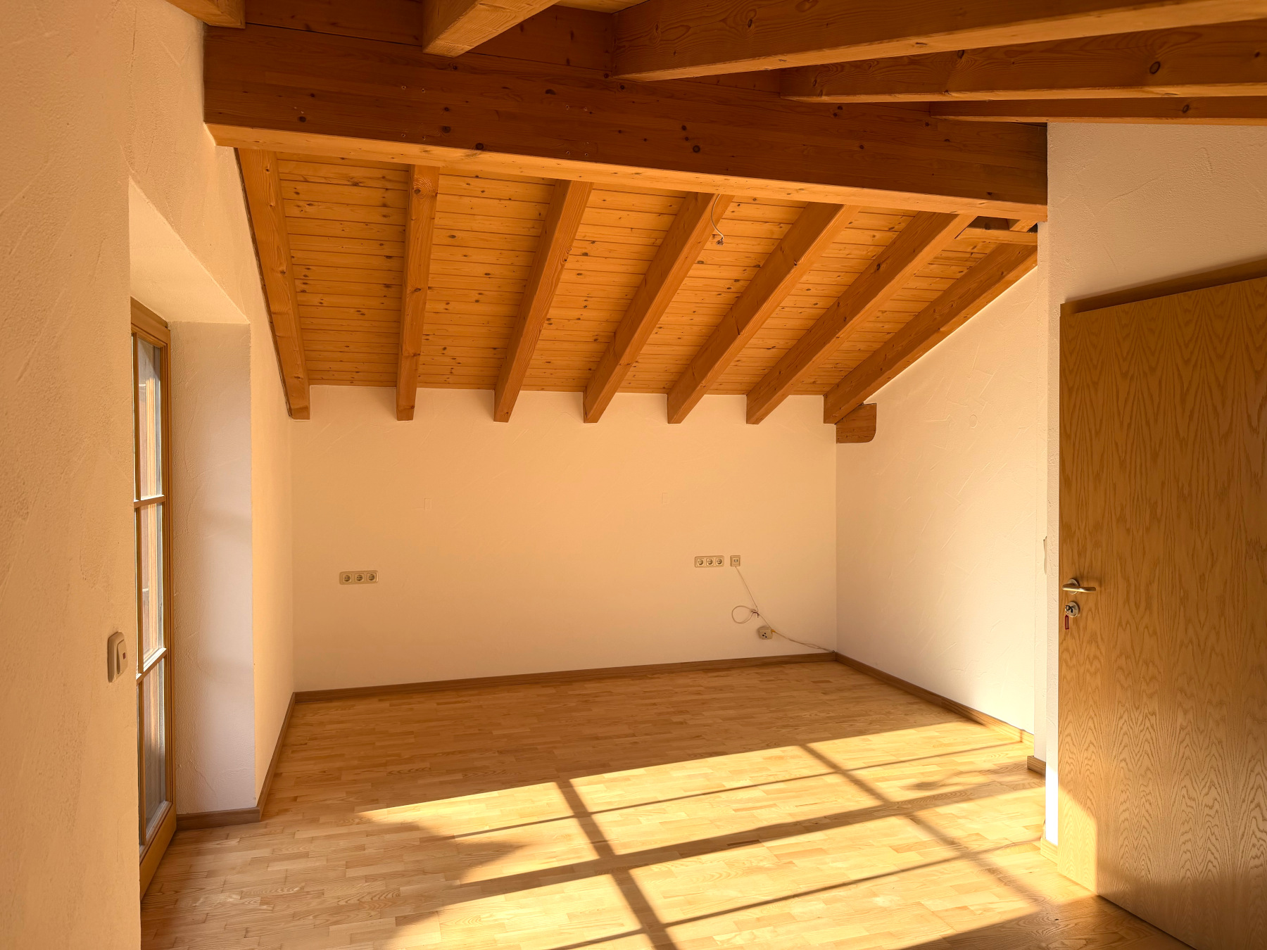 Im Obergeschoss ist das großzügige Schlafzimmer. Von hier aus gelangt man auf den Südbalkon, von dem aus man die Spitze des Rubihorns sieht. Das danebenliegende Zimmer ist ebenfalls schön groß und hat einen eigenen Balkon, der nach Westen ausgerichtet ist. Bad und WC sind voneinander getrennt. Das Badezimmer ist mit einer Wanne, einer Dusche und einem Doppelwaschbecken ausgestattet. Die sichtbaren und offenen Holzdecken im Obergeschoss sorgen für eine besondere Wohlfühlatmosphäre
